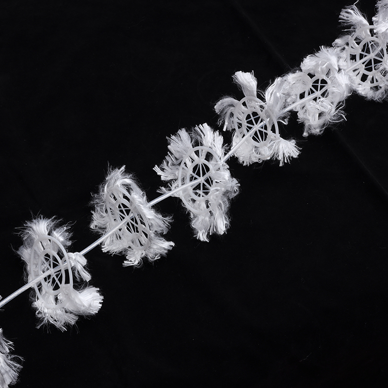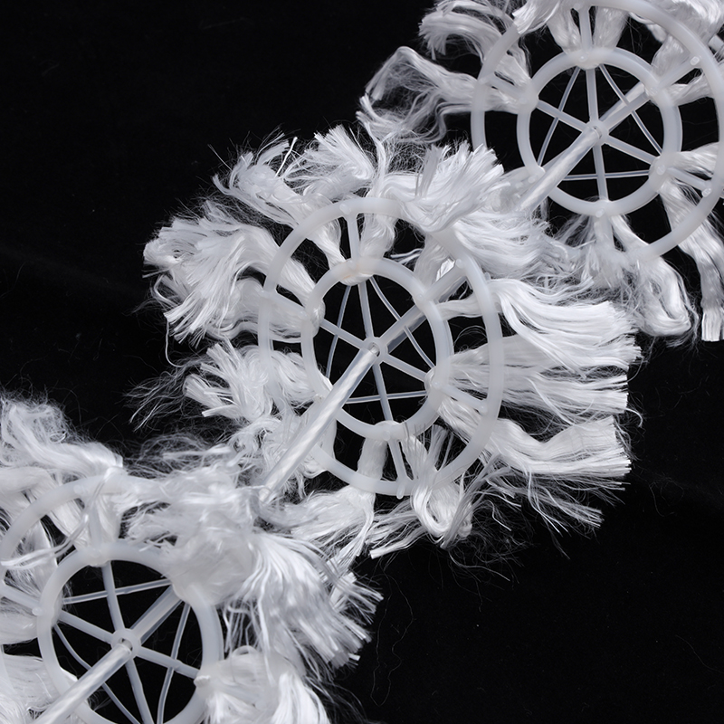 组合填料是在软性填料和半软性填料的基础上发展而成的,它兼有两者的优点。其结构是将塑料圆片压扣改成双圈大塑料环,将醛化纤维或涤纶丝压在环的环圈上,使纤维束均匀分布;内圈是雪花状塑料枝条,既能挂膜,又能有效切割气泡,提高氧的转移速率和利用率。使水气生物膜得到充分交换,使水中的有机物得到高效处理。适用范围